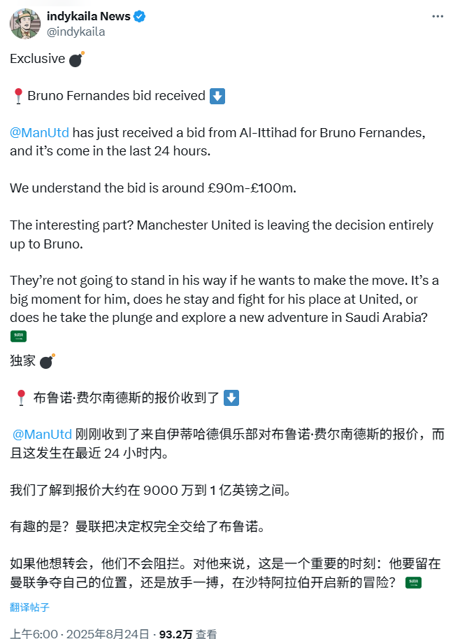 如今,沙特球队再次出手。据 indykaila 今日凌晨 6 点的消息,沙特豪门 吉达联合(原伊蒂哈德) 已向曼联递交了一份超过 9000万英镑 的报价。与上次相似,曼联高层依旧不愿直接拍板,而是把决定权交给了球员本人。